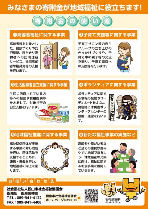 A.松山市社会福祉協議会への寄附については、高齢者や障がい者をはじめ、ボランティアなどの支援を必要とする地域住民の福祉の増進や災害ボランティア活動等のために使われます。