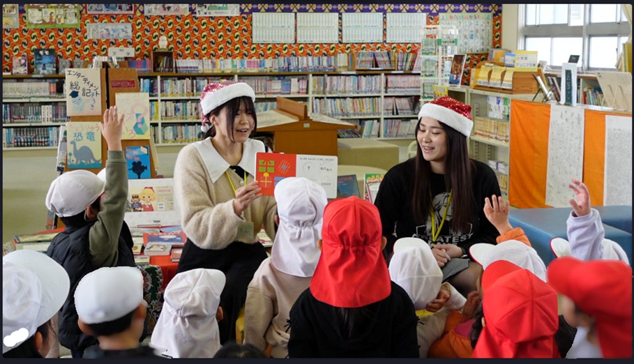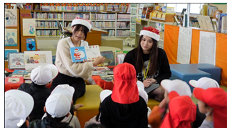 12月は松山大学司書教諭課程の学生2名が担当し、「クリスマスのかくれんぼ」と「へんしんプレゼント」というクリスマスにぴったりのお話を読んでくれました。クリスマスが近づいて、サンタさんに興味津々な子どもたち。目をキラキラ輝かせながら、絵本の世界をみんなで楽しみました。